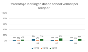 Leerlingen uit leerjaar 1 en 2 die de school verlaten doen dit in de meeste gevallen omdat de het schoolniveau niet passend blijkt te zijn. In het verleden had de school minder stringente overgangsnormen waardoor leerlingen in hogere leerjaren een een kans kregen om zich te verbeteren. Omdat we zien dat het aantal leerlingen met een kader / theoretisch advies sterk is gestegen hebben we deze normen aangepast om leerlingen sneller op een passend onderwijsniveau te krijgen.